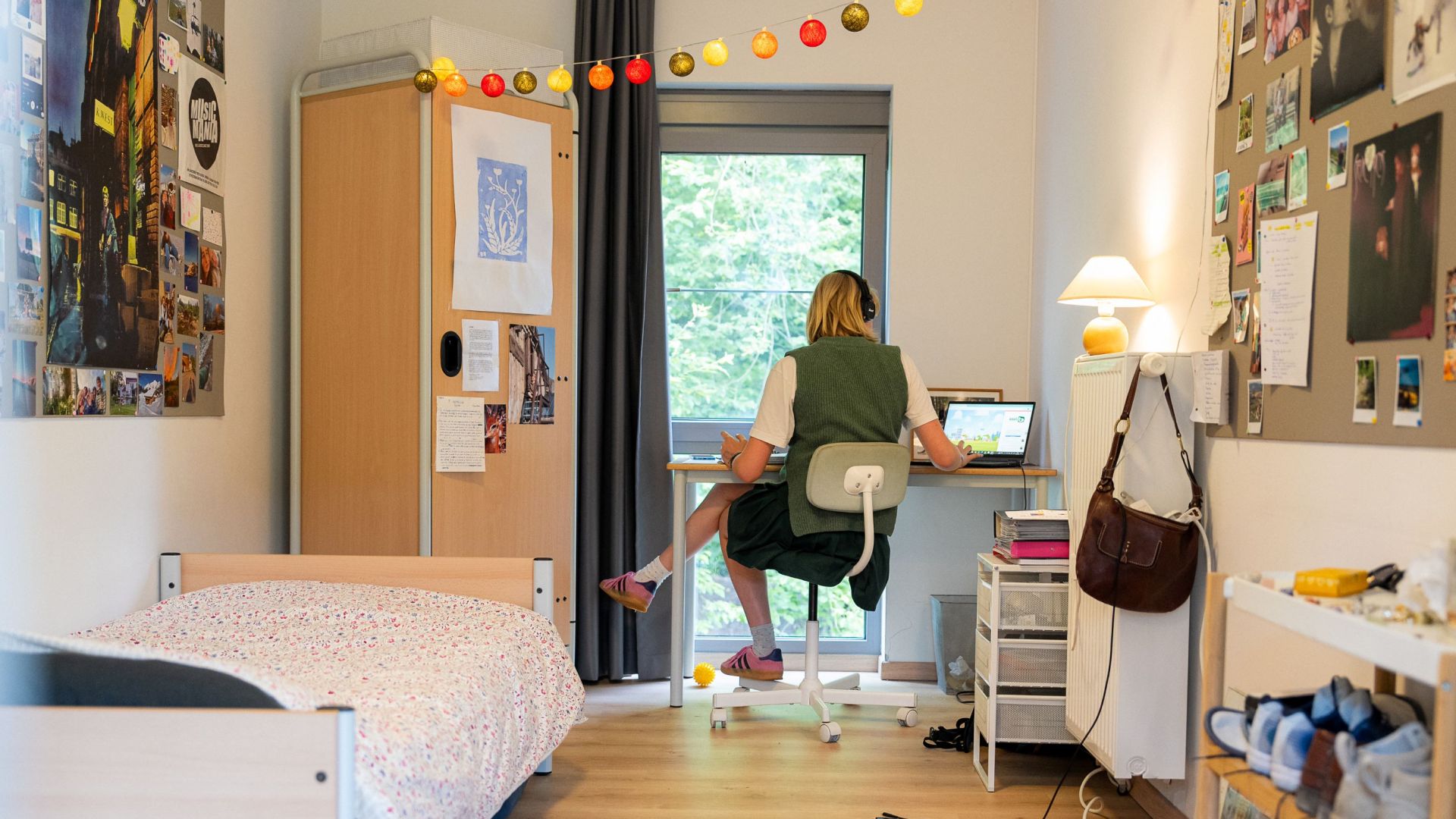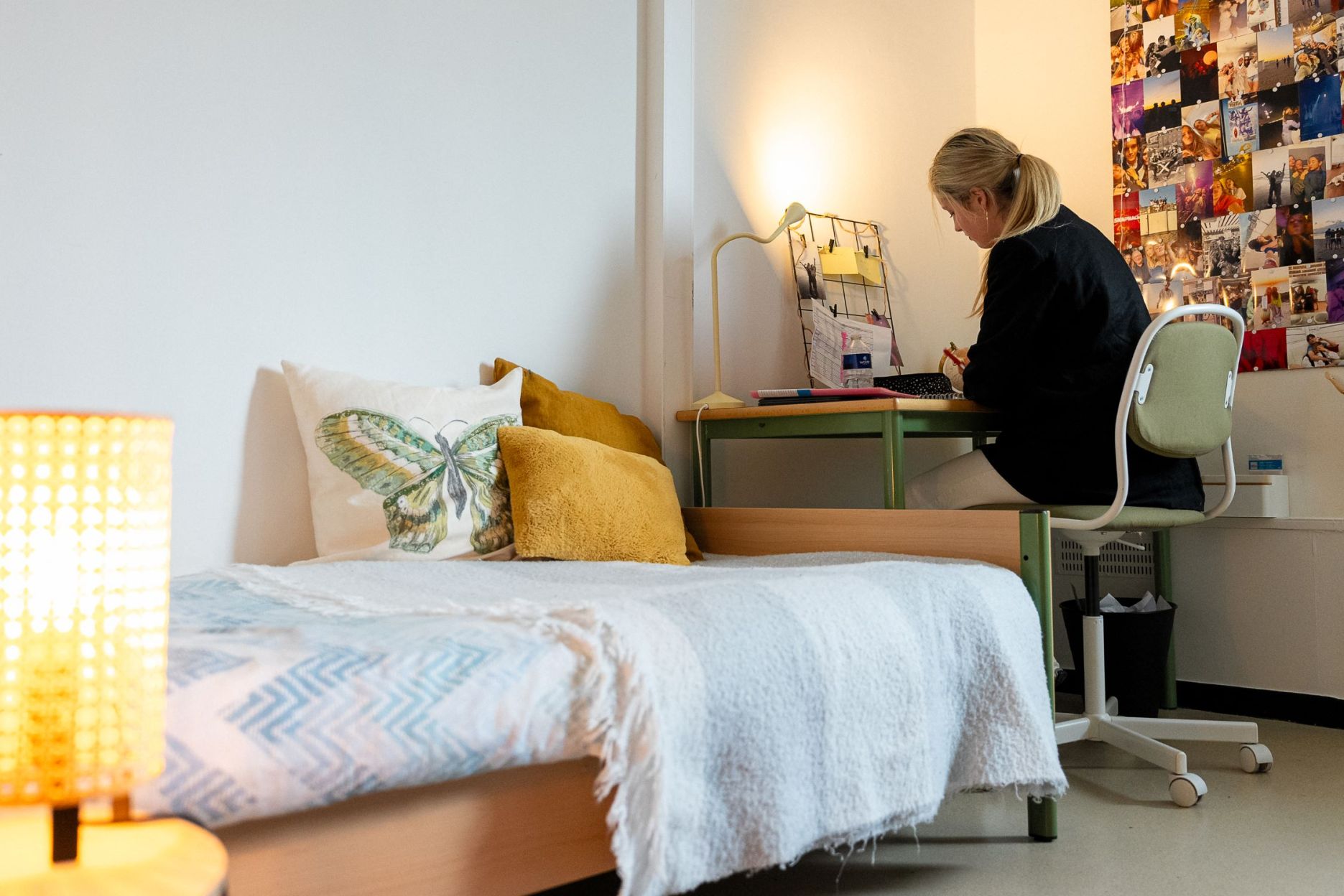 Elke kamer is voorzien van een bed met brandvertragende matras, kast, bureau, stoel, brandvertragende gordijnen en prikbord.